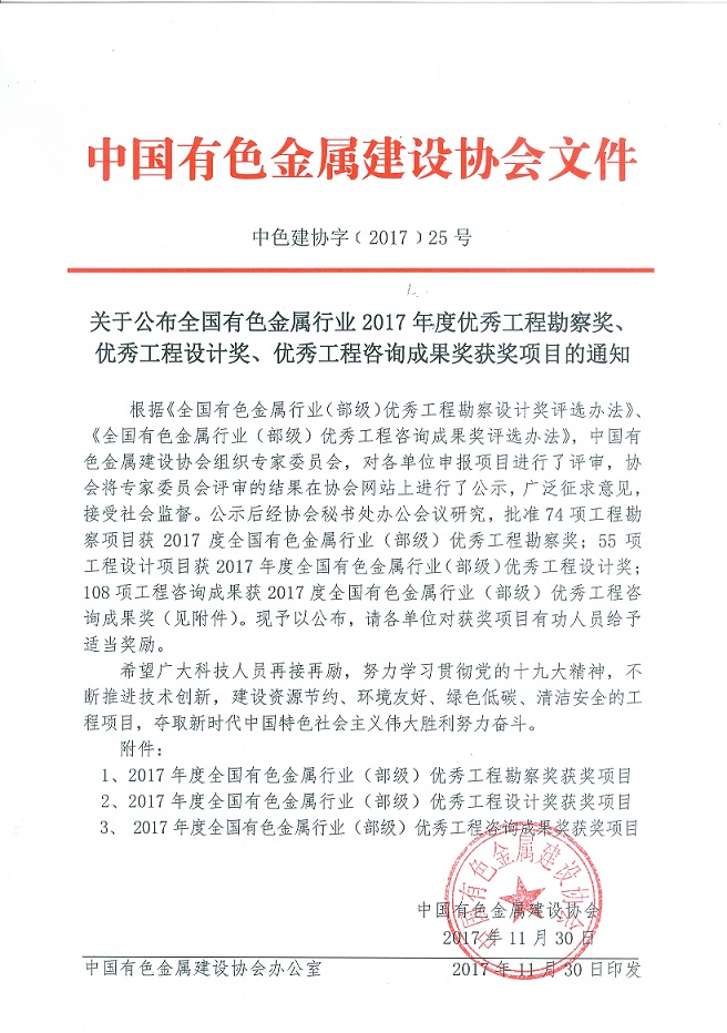 熱烈祝賀我公司兩項目榮獲全國有色金屬行業2017年度優秀工程勘察獎