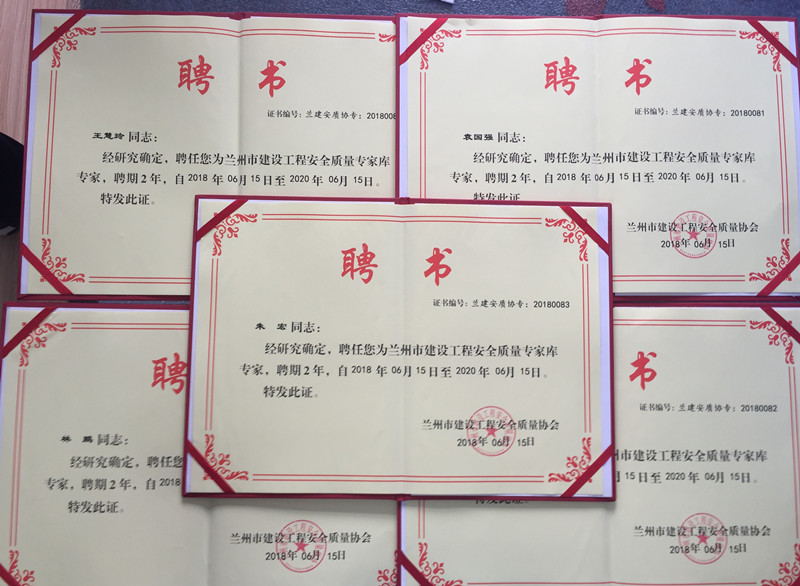 我公司于2018年4月申請成為蘭州市建設工程安全質量協會會員單位。該協會為進一步我市建設工程安全質量管理水平,完善和規范工程安全質量專家隊伍建設,充分發揮專家在工程安全質量檢查、咨詢、評價和指導等方面的作用,有效防范安全生產事故,更好地為企業和政府主管做好服務,根據住建部37號令《危險性較大的分部分項工程安全管理規定》我公司呂永平、朱宏、王惠玲、林鵬、袁國強被聘任為蘭州市建設工程安全質量專家庫專家。