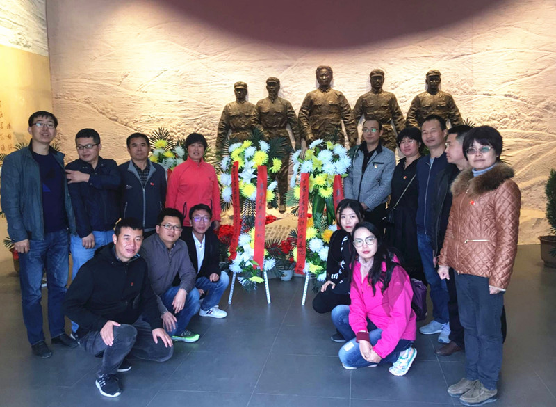 在莊嚴肅穆的紀念館前,大家奏唱國際歌,向革命先烈敬獻花籃鞠躬致敬,并面向黨旗,重溫了入黨誓詞,重新感受了那份莊重的承諾,那份厚重的責任。