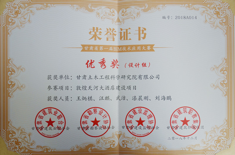 由甘肅省建筑業(yè)聯(lián)合會、甘肅省勘察設(shè)計協(xié)會、甘肅省建設(shè)監(jiān)理協(xié)會、甘肅省建筑職教集團主辦的甘肅省第一屆BIM技術(shù)應(yīng)用大賽頒獎典禮于近日舉行,由我公司建筑設(shè)計中心王炳棋、汪麒、武潔、漆晨剛、劉海鵬幾位專業(yè)技術(shù)人員負責(zé)的“敦煌天和大酒店建設(shè)項目”BIM技術(shù)優(yōu)化設(shè)計獲得設(shè)計組優(yōu)秀獎。