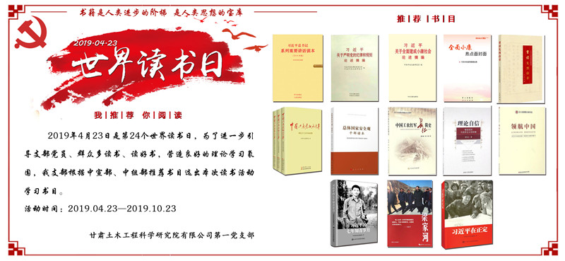 2019年4月23日適逢第24個世界讀書日,為了進一步引導支部黨員、群眾多讀書、讀好書,營造良好的理論學習氛圍,我支部根據中宣部、中組部推薦書目選出本次讀書活動學習書目。