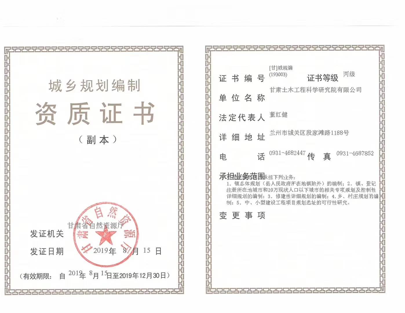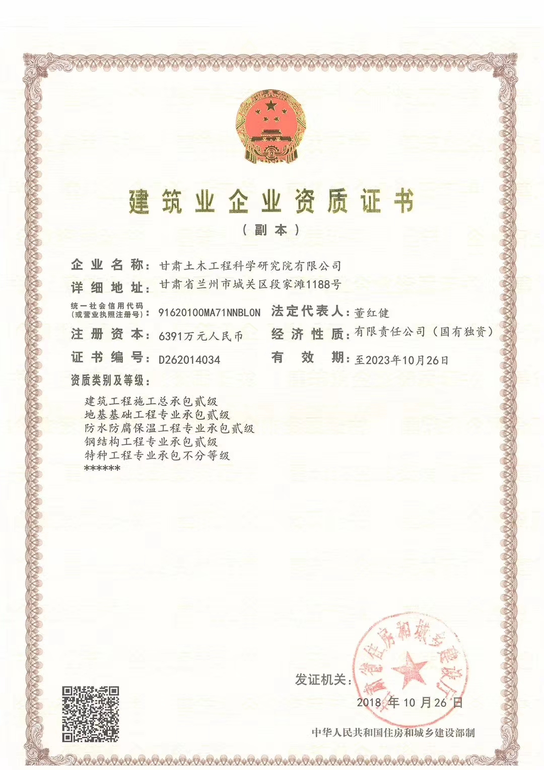 近日,公司建筑工程施工總承包貳級資質和城鄉(xiāng)規(guī)劃丙級資質獲甘肅省住房和城鄉(xiāng)建設廳和甘肅省自然資源廳批準,標志著公司資質建設取得重大進展。