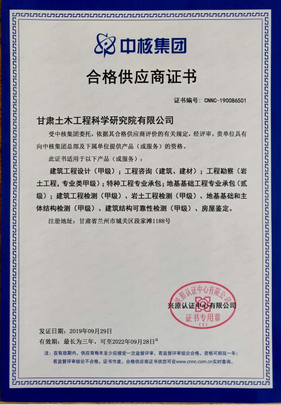 近日,公司成功通過中核集團興原認證中心有限公司和中核集團合格供應商專家委員會及管理委員會審核認證,順利獲得建筑工程設計(甲級);工程咨詢(建筑、建材);工程勘察(巖土工程,專業類甲級);特種工程專業承包;地基基礎工程專業承包(貳級);建筑工程檢測(甲級)、巖土工程檢測(甲級)、地基基礎和主體結構檢測(甲級)、建筑結構可靠性檢測(甲級)、房屋鑒定的合格供應商資格。