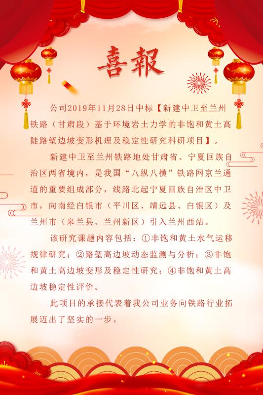 喜報 公司中標【新建中衛至蘭州鐵路(甘肅段)基于環境巖土力學的非飽和黃土高陡路塹邊坡變形機理及穩定性研究科研項目】