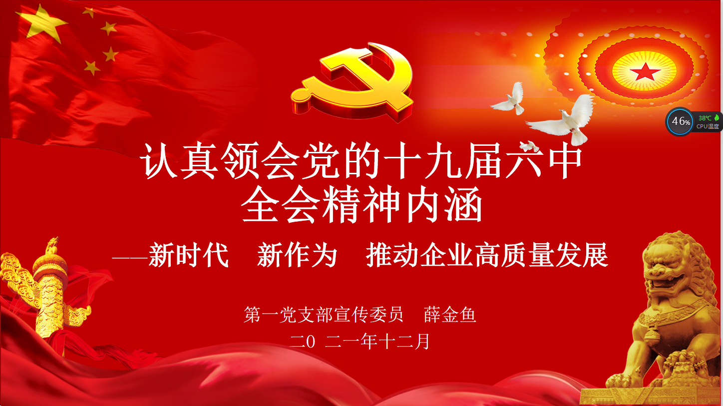 2021年12月15日下午,第一黨支部在公司第一會議室開展了支部委員講黨課活動,宣傳委員薛金魚同志以《認真領會當的十九屆六中全會精神內涵》為題,為第一支部全體黨員及入黨積極分子上了一堂主題鮮明、富有教育意義的黨課。