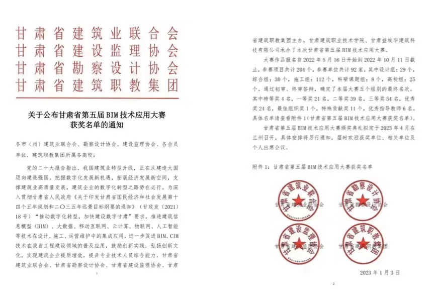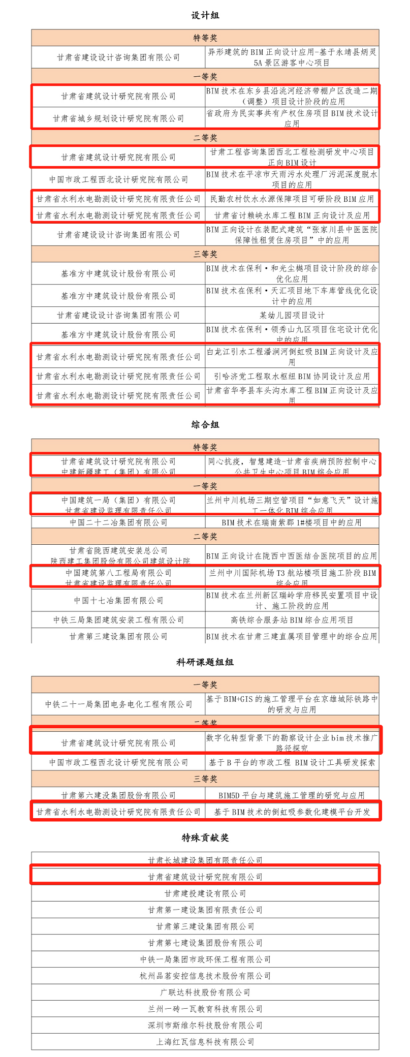 日前,甘肅省第五屆BIM技術應用大賽結果公布,甘肅工程咨詢集團共獲得14個獎項,其中,“BIM技術在東鄉縣沿洮河經濟帶棚戶區改造二期(調整)項目設計階段的應用”等8個項目分別獲設計組一、二、三等獎,“同心抗疫,智慧建造—甘肅省疾病預防控制中心公共衛生中心項目BIM綜合應用”等3個項目分別獲綜合組特等獎及一、二等獎,“數字化轉型背景下的勘察設計企業BIM技術推廣路徑探究”等2個項目分別獲科研課題組二、三等獎,建筑設計院獲特殊貢獻獎。