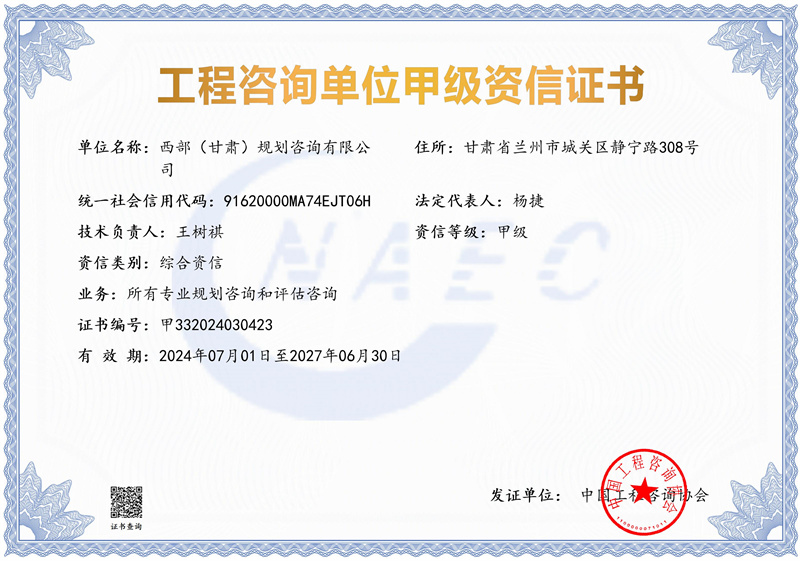 6月下旬,經中國工程咨詢協會評審,甘肅工程咨詢集團旗下西部(甘肅)規劃咨詢有限公司,成功取得工程咨詢單位綜合甲級資信和7項專業甲級資信,實現了我省工程咨詢“綜甲”從無到有的歷史性突破。西部(甘肅)規劃咨詢公司是甘肅工程咨詢集團著眼深化改革、優化資源配置、培育發展新業務而創建的綜合咨詢技術服務企業。公司圍繞貫徹落實國家重大戰略和全省發展規劃,組建專家智庫團隊,主動開展戰略性、前瞻性研究,先后高質量完多項重大咨詢任務。