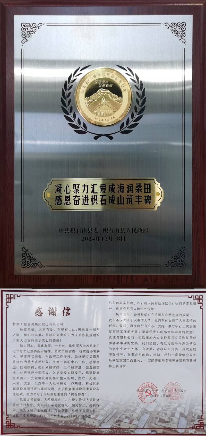 1月22日,時值北方農(nóng)歷小年。中共積石山縣委、積石山縣人民政府為甘肅工程咨詢集團(tuán)送來感謝信,對甘肅工程咨詢集團(tuán)在災(zāi)后恢復(fù)重建給予的大力支持表示感謝,并致以節(jié)日問候。