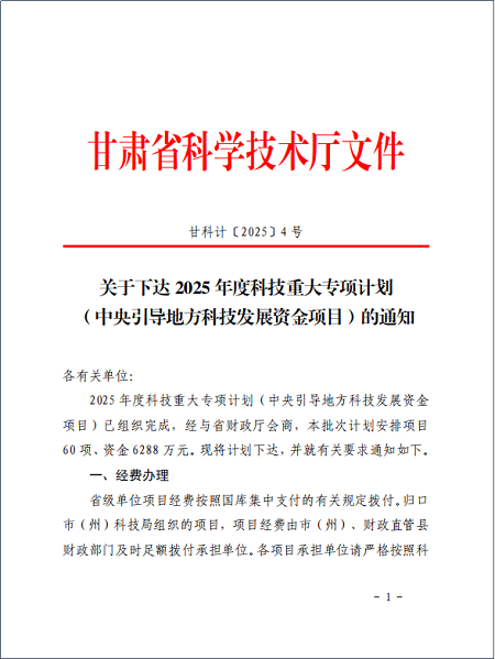 此次獲得甘肅省科技重大專項計劃立項,是對我公司科技創新和成果轉化工作的充分肯定公司將以此為契機,加大研發投入,加快推進項目建設,力爭早日實現項目產業化,為甘肅省經濟社會高質量發展做出新的貢獻