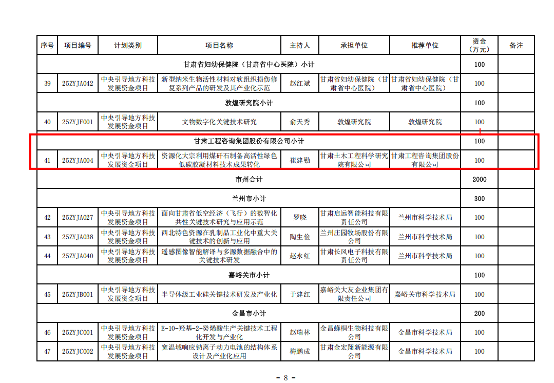 近日,甘肅省科技廳公布了2025年度科技重大專項計劃(中央引導地方科技發展資金項目)立項名單,我公司主持申報的“資源化大宗利用煤矸石制備高活性綠色低碳膠凝材料技術成果轉化”項目成功立項,標志著公司在煤矸石資源化利用領域取得重大突破,將為推動甘肅省綠色低碳發展貢獻力量。