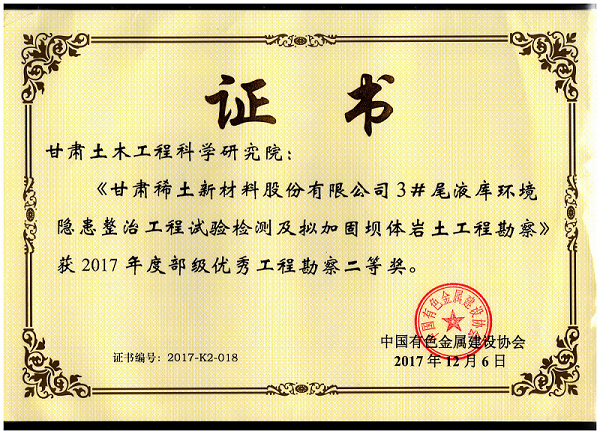 1.獲2017中國有色金屬建設協會部級優秀工程勘察二等獎;