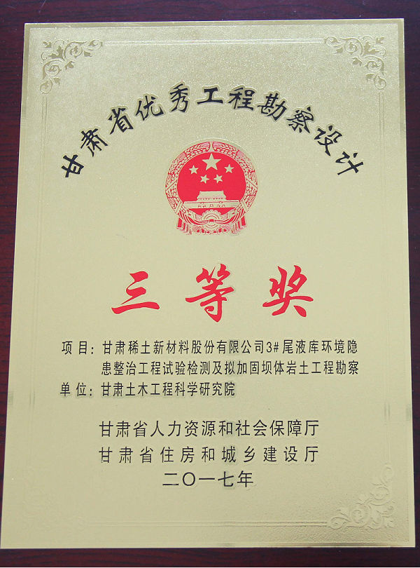 2.獲2017年度甘肅省優秀工程勘察設計三等獎。