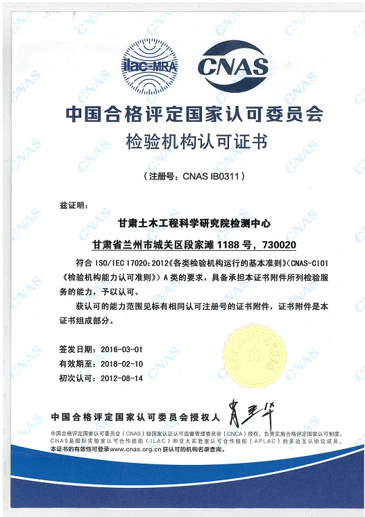 2012年2月首次依據(jù)CNAS-CL01建立了檢驗機(jī)構(gòu)質(zhì)量管理體系,2012年8月初次通過國家檢驗機(jī)構(gòu)認(rèn)可,檢驗領(lǐng)域為建筑地基(地基、樁基承載力試驗與評價)、建筑結(jié)構(gòu)(工程施工質(zhì)量評價、結(jié)構(gòu)設(shè)計復(fù)核、結(jié)構(gòu)抗震性能評價、結(jié)構(gòu)安全性與可靠性評價)、建筑節(jié)能(圍護(hù)結(jié)構(gòu)節(jié)能性能施工質(zhì)量及評價、建筑物能耗及節(jié)能綜合指標(biāo)評價)、混凝土(混凝土配合比質(zhì)量評定、混凝土質(zhì)量和生產(chǎn)過程質(zhì)量控制評定)。歷經(jīng)監(jiān)督檢查,換證復(fù)評審,持續(xù)有效運行5年。