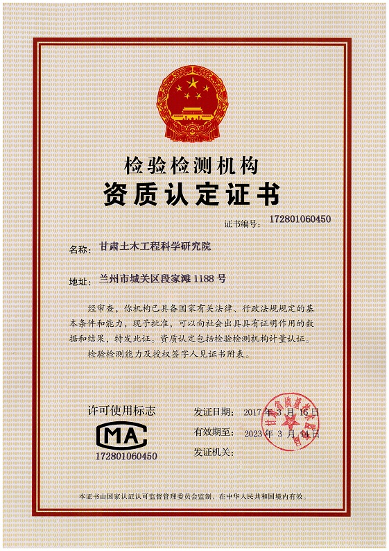 2003年初次通過甘肅省檢驗檢測機構資質認定,法律地位明確,組織機構健全,人員能力、儀器設備配置、場所環境條件等均滿足檢驗檢測工作要求。具備建筑材料、巖土工程、工程結構、建筑節能、室內環境、鋼結構檢測能力,通過了39類產品,736個參數的檢測能力認定。期間歷經多次監督評審、換證復評審,持續有效運行16年。