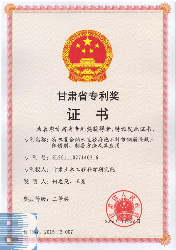 《有機(jī)復(fù)合納米直徑海泡石纖維鋼筋混凝土阻銹劑、制備方法及其應(yīng)用》(2015年度甘肅省專(zhuān)利獎(jiǎng)三等獎(jiǎng))